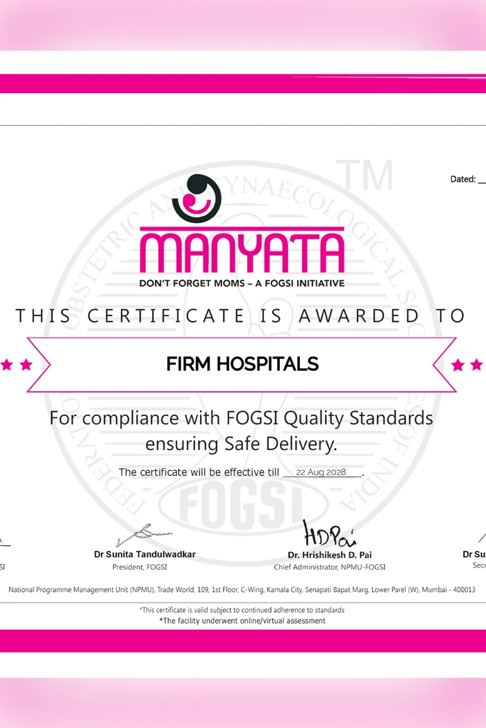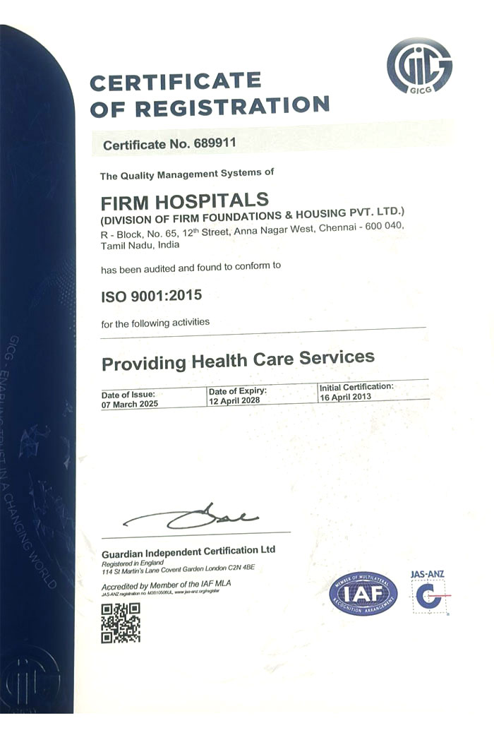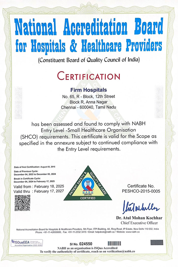 Firm Hospitals takes pride in maintaining the NABH Entry Level – Small Healthcare Organisation certification, awarded by the National Accreditation Board for Hospitals and Healthcare Providers (NABH), a constituent board of the Quality Council of India. Our journey toward excellence began in 2012, and in 2015, we achieved NABH accreditation. In addition, we are proud to hold the ISO 9001:2015 (IAF) Certification, a testament to our commitment to quality management and continuous improvement. Since then, we have continuously upheld the highest standards in patient care, ensuring safety, reliability, and excellence in healthcare.